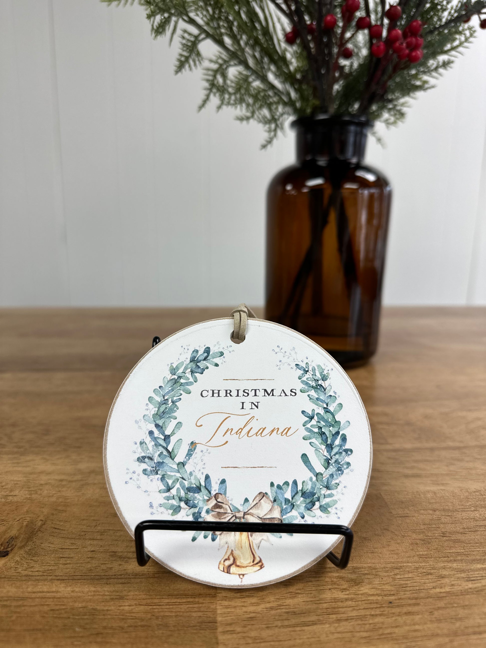 These classic 4" Wood Ornaments are handmade in Laurel, Mississippi. They are made of real wood and painted in watercolor style. Customized with “Christmas in Indiana” to create a keepsake to hang on your Christmas tree or gift to a loved one.