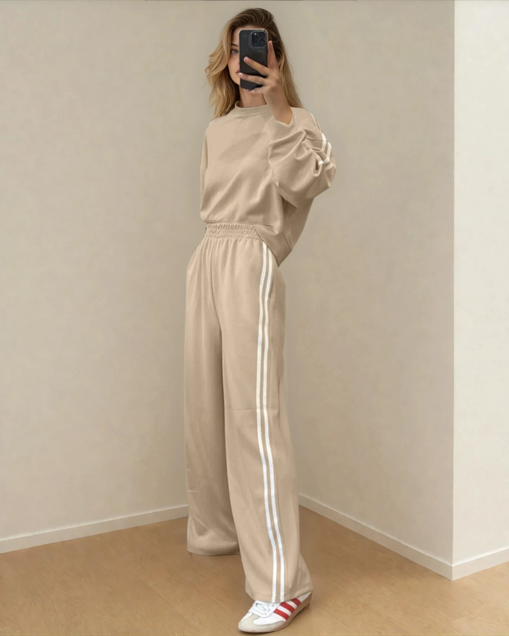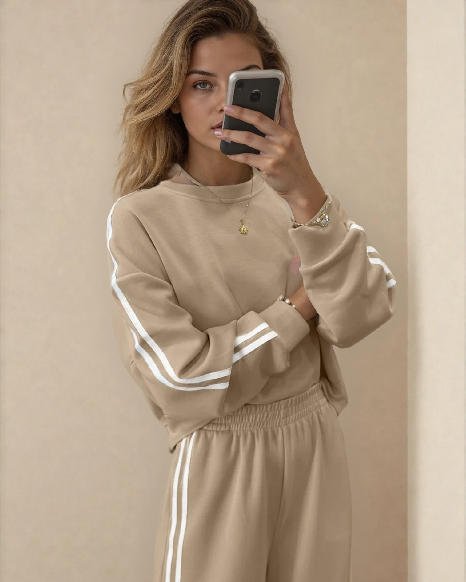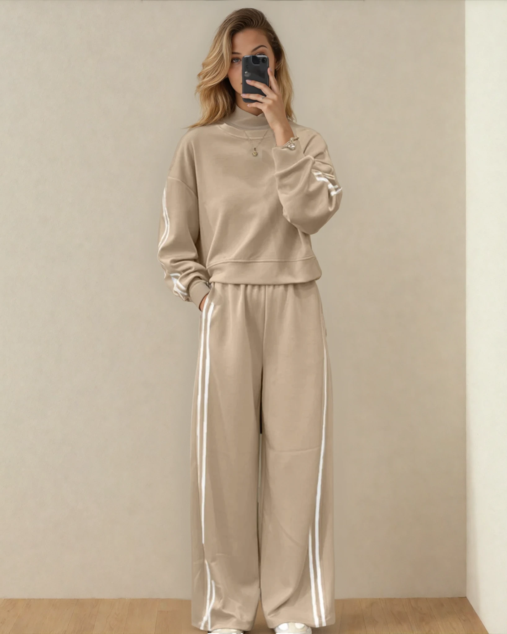 The pullover boasts long sleeves and a cozy round neck, perfect for staying stylish and comfortable all day long. Effortlessly transition from day to night with this stylish ensemble that offers a modern twist on classic athleisure wear. Made from high-quality materials, this outfit is designed to provide a flattering fit and durable wear for various occasions.